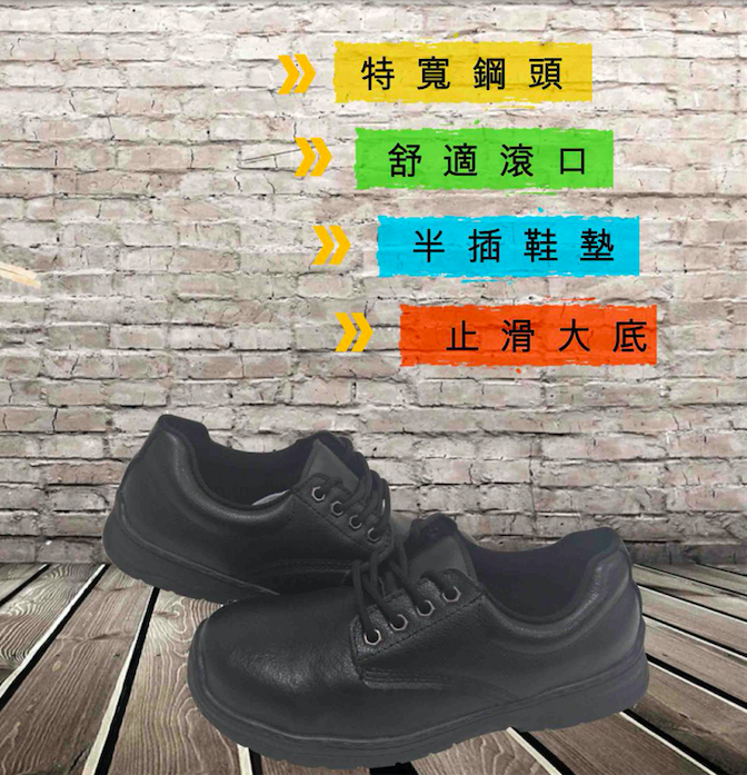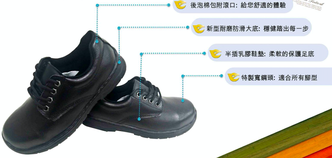 鋼頭:使用烤漆不锈鋼材質,寬楦鋼頭不夾腳,耐重壓1531公斤以上,品質達CNS重作業標準